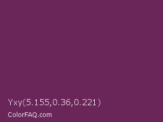 Yxy 5.155,0.36,0.221 Color is a dark magenta color and the nearest color is Finn #692d54. Hex code #6a2658 and RGB value is rgb(106,38,88). In RGB color space, this color is composed of 42% red, 15% green, 35% blue, In CMYK color space, this color is composed of 0% cyan, 64% magenta, 17% yellow , 58% black , In HSL color space, this color has a hue angle of 316° , 47% saturation and 28% lightness.