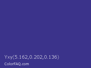 Yxy 5.162,0.202,0.136 Color is a normal indigo color and the nearest color is Minsk #3f307f. Hex code #3b338b and RGB value is rgb(59,51,139). In RGB color space, this color is composed of 23% red, 20% green, 55% blue, In CMYK color space, this color is composed of 58% cyan, 63% magenta, 0% yellow , 45% black , In HSL color space, this color has a hue angle of 245° , 46% saturation and 37% lightness.