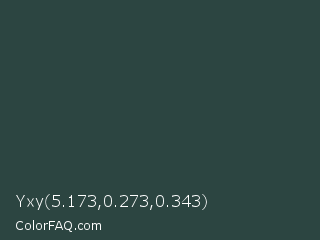 Yxy 5.173,0.273,0.343 Color is a very dark cyan color and the nearest color is Japanese Indigo #264348. Hex code #2c4541 and RGB value is rgb(44,69,65). In RGB color space, this color is composed of 17% red, 27% green, 25% blue, In CMYK color space, this color is composed of 36% cyan, 0% magenta, 6% yellow , 73% black , In HSL color space, this color has a hue angle of 170° , 22% saturation and 22% lightness.