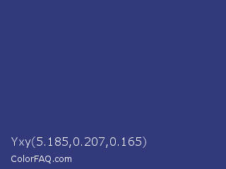Yxy 5.185,0.207,0.165 Color is a normal blue color and the nearest color is Astronaut #283a77. Hex code #333a7c and RGB value is rgb(51,58,124). In RGB color space, this color is composed of 20% red, 23% green, 49% blue, In CMYK color space, this color is composed of 59% cyan, 53% magenta, 0% yellow , 51% black , In HSL color space, this color has a hue angle of 234° , 42% saturation and 34% lightness.