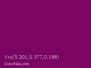 Yxy 5.201,0.377,0.188 Color is a dark magenta color and the nearest color is Cardinal Pink #8c055e. Hex code #7b0562 and RGB value is rgb(123,5,98). In RGB color space, this color is composed of 48% red, 2% green, 38% blue, In CMYK color space, this color is composed of 0% cyan, 96% magenta, 20% yellow , 52% black , In HSL color space, this color has a hue angle of 313° , 92% saturation and 25% lightness.
