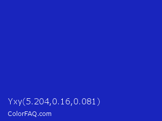 Yxy 5.204,0.16,0.081 Color is a normal blue color and the nearest color is Persian Blue #1c39bb. Hex code #1925bd and RGB value is rgb(25,37,189). In RGB color space, this color is composed of 10% red, 15% green, 74% blue, In CMYK color space, this color is composed of 87% cyan, 80% magenta, 0% yellow , 26% black , In HSL color space, this color has a hue angle of 236° , 77% saturation and 42% lightness.