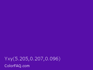 Yxy 5.205,0.207,0.096 Color is a normal violet color and the nearest color is Purple #660099. Hex code #570ea9 and RGB value is rgb(87,14,169). In RGB color space, this color is composed of 34% red, 5% green, 66% blue, In CMYK color space, this color is composed of 49% cyan, 92% magenta, 0% yellow , 34% black , In HSL color space, this color has a hue angle of 268° , 85% saturation and 36% lightness.