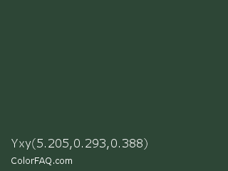 Yxy 5.205,0.293,0.388 Color is a dark green color and the nearest color is Kombu Green #354230. Hex code #2d4636 and RGB value is rgb(45,70,54). In RGB color space, this color is composed of 18% red, 27% green, 21% blue, In CMYK color space, this color is composed of 36% cyan, 0% magenta, 23% yellow , 73% black , In HSL color space, this color has a hue angle of 142° , 22% saturation and 23% lightness.