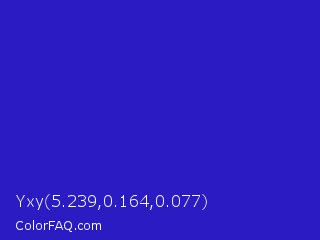 Yxy 5.239,0.164,0.077 Color is a normal indigo color and the nearest color is Interdimensional Blue #360ccc. Hex code #2a1cc2 and RGB value is rgb(42,28,194). In RGB color space, this color is composed of 16% red, 11% green, 76% blue, In CMYK color space, this color is composed of 78% cyan, 86% magenta, 0% yellow , 24% black , In HSL color space, this color has a hue angle of 245° , 75% saturation and 44% lightness.