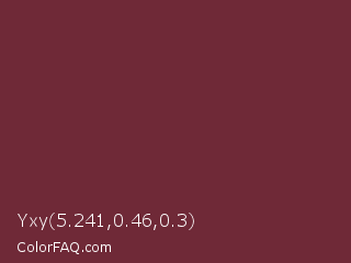 Yxy 5.241,0.46,0.3 Color is a dark red color and the nearest color is Wine #722f37. Hex code #6f2937 and RGB value is rgb(111,41,55). In RGB color space, this color is composed of 44% red, 16% green, 22% blue, In CMYK color space, this color is composed of 0% cyan, 63% magenta, 50% yellow , 56% black , In HSL color space, this color has a hue angle of 348° , 46% saturation and 30% lightness.