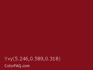 Yxy 5.246,0.589,0.318 Color is a dark red color and the nearest color is Falu Red #801818. Hex code #830f1b and RGB value is rgb(131,15,27). In RGB color space, this color is composed of 51% red, 6% green, 11% blue, In CMYK color space, this color is composed of 0% cyan, 89% magenta, 79% yellow , 49% black , In HSL color space, this color has a hue angle of 354° , 79% saturation and 29% lightness.
