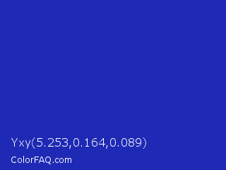 Yxy 5.253,0.164,0.089 Color is a normal blue color and the nearest color is Persian Blue #1c39bb. Hex code #1e2ab5 and RGB value is rgb(30,42,181). In RGB color space, this color is composed of 12% red, 16% green, 71% blue, In CMYK color space, this color is composed of 83% cyan, 77% magenta, 0% yellow , 29% black , In HSL color space, this color has a hue angle of 235° , 72% saturation and 41% lightness.