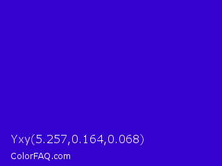Yxy 5.257,0.164,0.068 Color is a normal indigo color and the nearest color is Interdimensional Blue #360ccc. Hex code #3401cf and RGB value is rgb(52,1,207). In RGB color space, this color is composed of 20% red, 0% green, 81% blue, In CMYK color space, this color is composed of 75% cyan, 100% magenta, 0% yellow , 19% black , In HSL color space, this color has a hue angle of 255° , 99% saturation and 41% lightness.