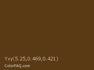 Yxy 5.25,0.469,0.421 Color is a very dark orange color and the nearest color is Pineapple #563c0d. Hex code #5a3a14 and RGB value is rgb(90,58,20). In RGB color space, this color is composed of 35% red, 23% green, 8% blue, In CMYK color space, this color is composed of 0% cyan, 36% magenta, 78% yellow , 65% black , In HSL color space, this color has a hue angle of 33° , 64% saturation and 22% lightness.
