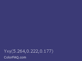 Yxy 5.264,0.222,0.177 Color is a normal indigo color and the nearest color is Minsk #3f307f. Hex code #3b3a76 and RGB value is rgb(59,58,118). In RGB color space, this color is composed of 23% red, 23% green, 46% blue, In CMYK color space, this color is composed of 50% cyan, 51% magenta, 0% yellow , 54% black , In HSL color space, this color has a hue angle of 241° , 34% saturation and 35% lightness.