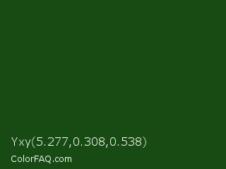 Yxy 5.277,0.308,0.538 Color is a very dark green color and the nearest color is Parsley #134f19. Hex code #184b14 and RGB value is rgb(24,75,20). In RGB color space, this color is composed of 9% red, 29% green, 8% blue, In CMYK color space, this color is composed of 68% cyan, 0% magenta, 73% yellow , 71% black , In HSL color space, this color has a hue angle of 116° , 58% saturation and 19% lightness.