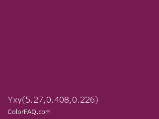 Yxy 5.27,0.408,0.226 Color is a dark magenta color and the nearest color is Pansy Purple #78184a. Hex code #771a52 and RGB value is rgb(119,26,82). In RGB color space, this color is composed of 47% red, 10% green, 32% blue, In CMYK color space, this color is composed of 0% cyan, 78% magenta, 31% yellow , 53% black , In HSL color space, this color has a hue angle of 324° , 64% saturation and 28% lightness.