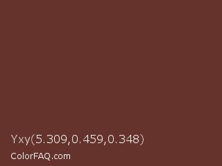 Yxy 5.309,0.459,0.348 Color is a dark red color and the nearest color is Buccaneer #622f30. Hex code #65332b and RGB value is rgb(101,51,43). In RGB color space, this color is composed of 40% red, 20% green, 17% blue, In CMYK color space, this color is composed of 0% cyan, 50% magenta, 57% yellow , 60% black , In HSL color space, this color has a hue angle of 8° , 40% saturation and 28% lightness.