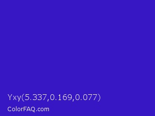 Yxy 5.337,0.169,0.077 Color is a normal indigo color and the nearest color is Interdimensional Blue #360ccc. Hex code #3617c3 and RGB value is rgb(54,23,195). In RGB color space, this color is composed of 21% red, 9% green, 76% blue, In CMYK color space, this color is composed of 72% cyan, 88% magenta, 0% yellow , 24% black , In HSL color space, this color has a hue angle of 251° , 79% saturation and 43% lightness.