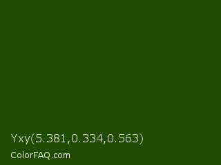 Yxy 5.381,0.334,0.563 Color is a very dark green color and the nearest color is Green House #24500f. Hex code #224b04 and RGB value is rgb(34,75,4). In RGB color space, this color is composed of 13% red, 29% green, 2% blue, In CMYK color space, this color is composed of 55% cyan, 0% magenta, 95% yellow , 71% black , In HSL color space, this color has a hue angle of 95° , 90% saturation and 15% lightness.