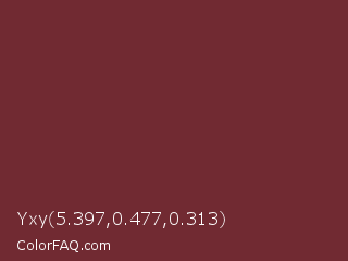 Yxy 5.397,0.477,0.313 Color is a dark red color and the nearest color is Wine #722f37. Hex code #712a32 and RGB value is rgb(113,42,50). In RGB color space, this color is composed of 44% red, 16% green, 20% blue, In CMYK color space, this color is composed of 0% cyan, 63% magenta, 56% yellow , 56% black , In HSL color space, this color has a hue angle of 353° , 46% saturation and 30% lightness.