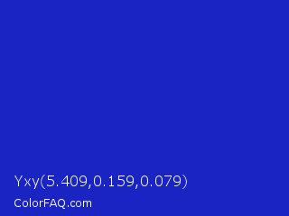 Yxy 5.409,0.159,0.079 Color is a normal blue color and the nearest color is Persian Blue #1c39bb. Hex code #1924c3 and RGB value is rgb(25,36,195). In RGB color space, this color is composed of 10% red, 14% green, 76% blue, In CMYK color space, this color is composed of 87% cyan, 82% magenta, 0% yellow , 24% black , In HSL color space, this color has a hue angle of 236° , 77% saturation and 43% lightness.