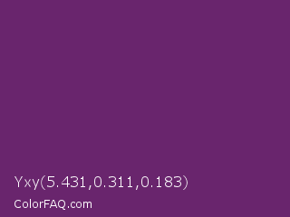 Yxy 5.431,0.311,0.183 Color is a dark magenta color and the nearest color is Midnight #702670. Hex code #69256d and RGB value is rgb(105,37,109). In RGB color space, this color is composed of 41% red, 15% green, 43% blue, In CMYK color space, this color is composed of 4% cyan, 66% magenta, 0% yellow , 57% black , In HSL color space, this color has a hue angle of 297° , 49% saturation and 29% lightness.