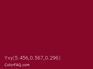 Yxy 5.456,0.567,0.296 Color is a dark red color and the nearest color is Monarch #8b0723. Hex code #870728 and RGB value is rgb(135,7,40). In RGB color space, this color is composed of 53% red, 3% green, 16% blue, In CMYK color space, this color is composed of 0% cyan, 95% magenta, 70% yellow , 47% black , In HSL color space, this color has a hue angle of 345° , 90% saturation and 28% lightness.