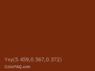 Yxy 5.459,0.567,0.372 Color is a dark orange color and the nearest color is Pueblo #7d2c14. Hex code #76290a and RGB value is rgb(118,41,10). In RGB color space, this color is composed of 46% red, 16% green, 4% blue, In CMYK color space, this color is composed of 0% cyan, 65% magenta, 92% yellow , 54% black , In HSL color space, this color has a hue angle of 17° , 84% saturation and 25% lightness.