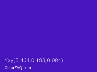 Yxy 5.464,0.183,0.084 Color is a normal indigo color and the nearest color is Interdimensional Blue #360ccc. Hex code #4814bb and RGB value is rgb(72,20,187). In RGB color space, this color is composed of 28% red, 8% green, 73% blue, In CMYK color space, this color is composed of 61% cyan, 89% magenta, 0% yellow , 27% black , In HSL color space, this color has a hue angle of 259° , 81% saturation and 41% lightness.