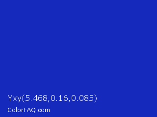 Yxy 5.468,0.16,0.085 Color is a normal blue color and the nearest color is Persian Blue #1c39bb. Hex code #152abd and RGB value is rgb(21,42,189). In RGB color space, this color is composed of 8% red, 16% green, 74% blue, In CMYK color space, this color is composed of 89% cyan, 78% magenta, 0% yellow , 26% black , In HSL color space, this color has a hue angle of 233° , 80% saturation and 41% lightness.
