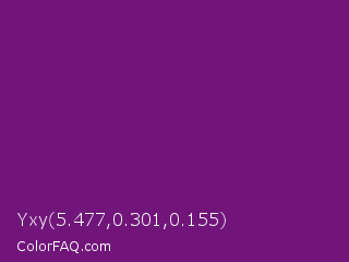 Yxy 5.477,0.301,0.155 Color is a dark magenta color and the nearest color is Midnight #702670. Hex code #71157b and RGB value is rgb(113,21,123). In RGB color space, this color is composed of 44% red, 8% green, 48% blue, In CMYK color space, this color is composed of 8% cyan, 83% magenta, 0% yellow , 52% black , In HSL color space, this color has a hue angle of 294° , 71% saturation and 28% lightness.