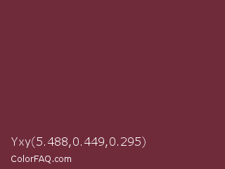 Yxy 5.488,0.449,0.295 Color is a dark red color and the nearest color is Wine #722f37. Hex code #702b3b and RGB value is rgb(112,43,59). In RGB color space, this color is composed of 44% red, 17% green, 23% blue, In CMYK color space, this color is composed of 0% cyan, 62% magenta, 47% yellow , 56% black , In HSL color space, this color has a hue angle of 346° , 45% saturation and 30% lightness.