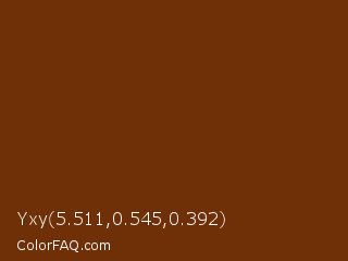 Yxy 5.511,0.545,0.392 Color is a dark orange color and the nearest color is Nutmeg Wood Finish #683600. Hex code #6f3008 and RGB value is rgb(111,48,8). In RGB color space, this color is composed of 44% red, 19% green, 3% blue, In CMYK color space, this color is composed of 0% cyan, 57% magenta, 93% yellow , 56% black , In HSL color space, this color has a hue angle of 23° , 87% saturation and 23% lightness.