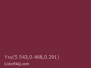 Yxy 5.543,0.468,0.291 Color is a normal red color and the nearest color is Wine #722f37. Hex code #76263a and RGB value is rgb(118,38,58). In RGB color space, this color is composed of 46% red, 15% green, 23% blue, In CMYK color space, this color is composed of 0% cyan, 68% magenta, 51% yellow , 54% black , In HSL color space, this color has a hue angle of 345° , 51% saturation and 31% lightness.