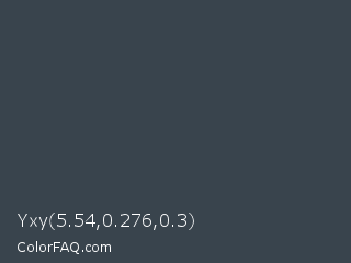 Yxy 5.54,0.276,0.3 Color is a dark blue color and the nearest color is Arsenic #3b444b. Hex code #39444d and RGB value is rgb(57,68,77). In RGB color space, this color is composed of 22% red, 27% green, 30% blue, In CMYK color space, this color is composed of 26% cyan, 12% magenta, 0% yellow , 70% black , In HSL color space, this color has a hue angle of 207° , 15% saturation and 26% lightness.
