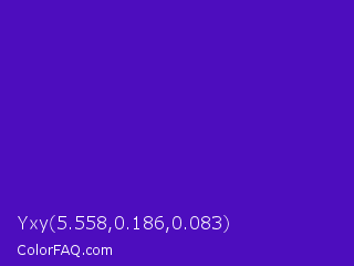 Yxy 5.558,0.186,0.083 Color is a normal violet color and the nearest color is Interdimensional Blue #360ccc. Hex code #4d0dbe and RGB value is rgb(77,13,190). In RGB color space, this color is composed of 30% red, 5% green, 75% blue, In CMYK color space, this color is composed of 59% cyan, 93% magenta, 0% yellow , 25% black , In HSL color space, this color has a hue angle of 262° , 87% saturation and 40% lightness.