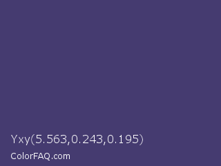 Yxy 5.563,0.243,0.195 Color is a normal indigo color and the nearest color is Mulled Wine #4e4562. Hex code #453b70 and RGB value is rgb(69,59,112). In RGB color space, this color is composed of 27% red, 23% green, 44% blue, In CMYK color space, this color is composed of 38% cyan, 47% magenta, 0% yellow , 56% black , In HSL color space, this color has a hue angle of 251° , 31% saturation and 34% lightness.