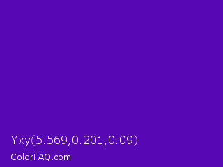 Yxy 5.569,0.201,0.09 Color is a normal violet color and the nearest color is Purple #660099. Hex code #5807b5 and RGB value is rgb(88,7,181). In RGB color space, this color is composed of 35% red, 3% green, 71% blue, In CMYK color space, this color is composed of 51% cyan, 96% magenta, 0% yellow , 29% black , In HSL color space, this color has a hue angle of 268° , 93% saturation and 37% lightness.