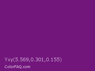 Yxy 5.569,0.301,0.155 Color is a dark magenta color and the nearest color is Midnight #702670. Hex code #72167c and RGB value is rgb(114,22,124). In RGB color space, this color is composed of 45% red, 9% green, 49% blue, In CMYK color space, this color is composed of 8% cyan, 82% magenta, 0% yellow , 51% black , In HSL color space, this color has a hue angle of 294° , 70% saturation and 29% lightness.