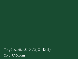 Yxy 5.585,0.273,0.433 Color is a very dark green color and the nearest color is Cal Poly Pomona Green #1e4d2b. Hex code #184c31 and RGB value is rgb(24,76,49). In RGB color space, this color is composed of 9% red, 30% green, 19% blue, In CMYK color space, this color is composed of 68% cyan, 0% magenta, 36% yellow , 70% black , In HSL color space, this color has a hue angle of 149° , 52% saturation and 20% lightness.