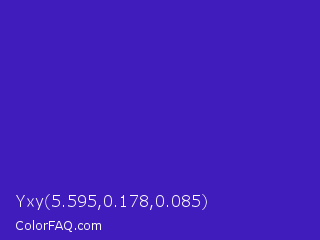 Yxy 5.595,0.178,0.085 Color is a normal indigo color and the nearest color is Interdimensional Blue #360ccc. Hex code #401cbd and RGB value is rgb(64,28,189). In RGB color space, this color is composed of 25% red, 11% green, 74% blue, In CMYK color space, this color is composed of 66% cyan, 85% magenta, 0% yellow , 26% black , In HSL color space, this color has a hue angle of 253° , 74% saturation and 43% lightness.