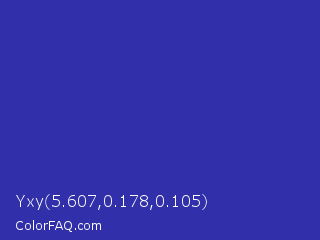 Yxy 5.607,0.178,0.105 Color is a normal indigo color and the nearest color is Governor Bay #2f3cb3. Hex code #312fa9 and RGB value is rgb(49,47,169). In RGB color space, this color is composed of 19% red, 18% green, 66% blue, In CMYK color space, this color is composed of 71% cyan, 72% magenta, 0% yellow , 34% black , In HSL color space, this color has a hue angle of 241° , 56% saturation and 42% lightness.