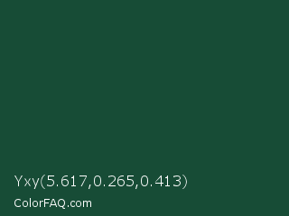 Yxy 5.617,0.265,0.413 Color is a very dark green color and the nearest color is MSU Green #18453b. Hex code #174c36 and RGB value is rgb(23,76,54). In RGB color space, this color is composed of 9% red, 30% green, 21% blue, In CMYK color space, this color is composed of 70% cyan, 0% magenta, 29% yellow , 70% black , In HSL color space, this color has a hue angle of 155° , 54% saturation and 19% lightness.