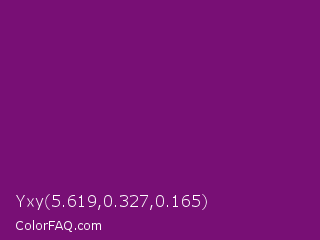 Yxy 5.619,0.327,0.165 Color is a dark magenta color and the nearest color is Patriarch #800080. Hex code #780f75 and RGB value is rgb(120,15,117). In RGB color space, this color is composed of 47% red, 6% green, 46% blue, In CMYK color space, this color is composed of 0% cyan, 88% magenta, 3% yellow , 53% black , In HSL color space, this color has a hue angle of 302° , 78% saturation and 26% lightness.