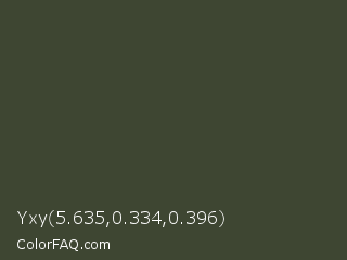 Yxy 5.635,0.334,0.396 Color is a dark green color and the nearest color is Kelp #454936. Hex code #3e4632 and RGB value is rgb(62,70,50). In RGB color space, this color is composed of 24% red, 27% green, 20% blue, In CMYK color space, this color is composed of 11% cyan, 0% magenta, 29% yellow , 73% black , In HSL color space, this color has a hue angle of 84° , 17% saturation and 24% lightness.