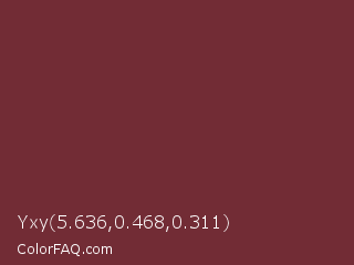 Yxy 5.636,0.468,0.311 Color is a normal red color and the nearest color is Wine #722f37. Hex code #722c35 and RGB value is rgb(114,44,53). In RGB color space, this color is composed of 45% red, 17% green, 21% blue, In CMYK color space, this color is composed of 0% cyan, 61% magenta, 54% yellow , 55% black , In HSL color space, this color has a hue angle of 352° , 44% saturation and 31% lightness.