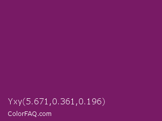 Yxy 5.671,0.361,0.196 Color is a dark magenta color and the nearest color is Byzantium #702963. Hex code #781a65 and RGB value is rgb(120,26,101). In RGB color space, this color is composed of 47% red, 10% green, 40% blue, In CMYK color space, this color is composed of 0% cyan, 78% magenta, 16% yellow , 53% black , In HSL color space, this color has a hue angle of 312° , 64% saturation and 29% lightness.