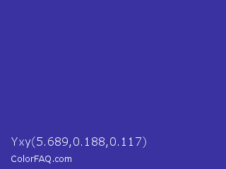 Yxy 5.689,0.188,0.117 Color is a normal indigo color and the nearest color is Blue Pigment #333399. Hex code #3932a0 and RGB value is rgb(57,50,160). In RGB color space, this color is composed of 22% red, 20% green, 63% blue, In CMYK color space, this color is composed of 64% cyan, 69% magenta, 0% yellow , 37% black , In HSL color space, this color has a hue angle of 244° , 52% saturation and 41% lightness.