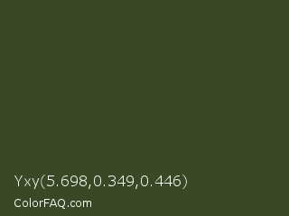 Yxy 5.698,0.349,0.446 Color is a very dark green color and the nearest color is Kombu Green #354230. Hex code #3b4825 and RGB value is rgb(59,72,37). In RGB color space, this color is composed of 23% red, 28% green, 15% blue, In CMYK color space, this color is composed of 18% cyan, 0% magenta, 49% yellow , 72% black , In HSL color space, this color has a hue angle of 82° , 32% saturation and 21% lightness.