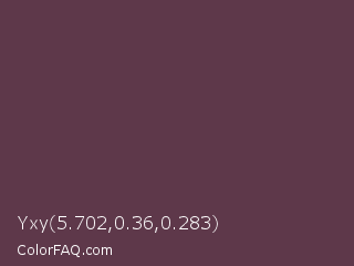 Yxy 5.702,0.36,0.283 Color is a dark rose color and the nearest color is Dark Byzantium #5d3954. Hex code #5e384a and RGB value is rgb(94,56,74). In RGB color space, this color is composed of 37% red, 22% green, 29% blue, In CMYK color space, this color is composed of 0% cyan, 40% magenta, 21% yellow , 63% black , In HSL color space, this color has a hue angle of 332° , 25% saturation and 29% lightness.