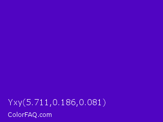 Yxy 5.711,0.186,0.081 Color is a normal violet color and the nearest color is Interdimensional Blue #360ccc. Hex code #5005c2 and RGB value is rgb(80,5,194). In RGB color space, this color is composed of 31% red, 2% green, 76% blue, In CMYK color space, this color is composed of 59% cyan, 97% magenta, 0% yellow , 24% black , In HSL color space, this color has a hue angle of 264° , 95% saturation and 39% lightness.