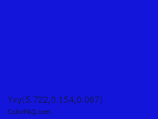 Yxy 5.722,0.154,0.067 Color is a normal blue color and the nearest color is Bluebonnet #1c1cf0. Hex code #1315da and RGB value is rgb(19,21,218). In RGB color space, this color is composed of 7% red, 8% green, 85% blue, In CMYK color space, this color is composed of 91% cyan, 90% magenta, 0% yellow , 15% black , In HSL color space, this color has a hue angle of 239° , 84% saturation and 46% lightness.
