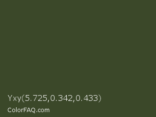 Yxy 5.725,0.342,0.433 Color is a very dark green color and the nearest color is Kombu Green #354230. Hex code #3b4829 and RGB value is rgb(59,72,41). In RGB color space, this color is composed of 23% red, 28% green, 16% blue, In CMYK color space, this color is composed of 18% cyan, 0% magenta, 43% yellow , 72% black , In HSL color space, this color has a hue angle of 85° , 27% saturation and 22% lightness.